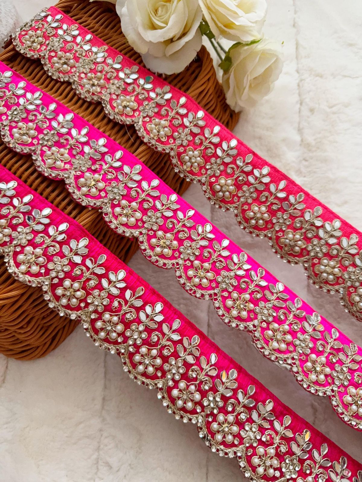 Intricate mirror lace with handcrafted embellishments. Perfect for elegant, traditional occasions