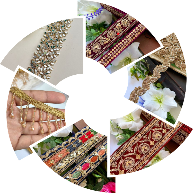 Each saree border and lace features sequins, or beading.
